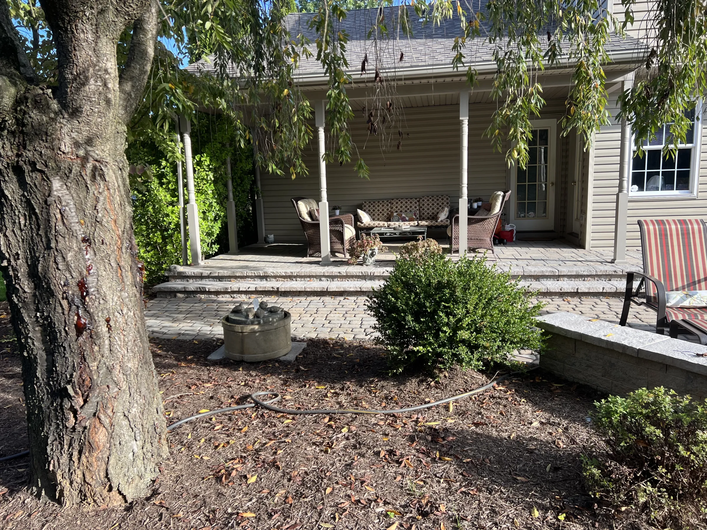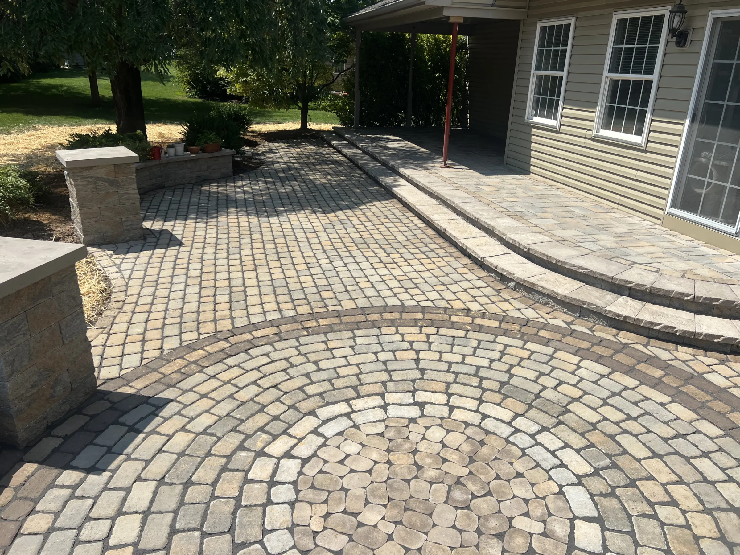 Replacing the existing deck with an updated Old World–inspired patio was the homeowners’ long-held dream. The objective was to remove the deck and seamlessly integrate the covered concrete porch with a new patio nestled within the surrounding gardens. To accomplish this, the concrete porch was extended across the back of the house to the patio doors, creating a natural connection between the indoor and outdoor living spaces. The full length of this transition was designed as a wide, continuous step, enhancing openness and visual flow.