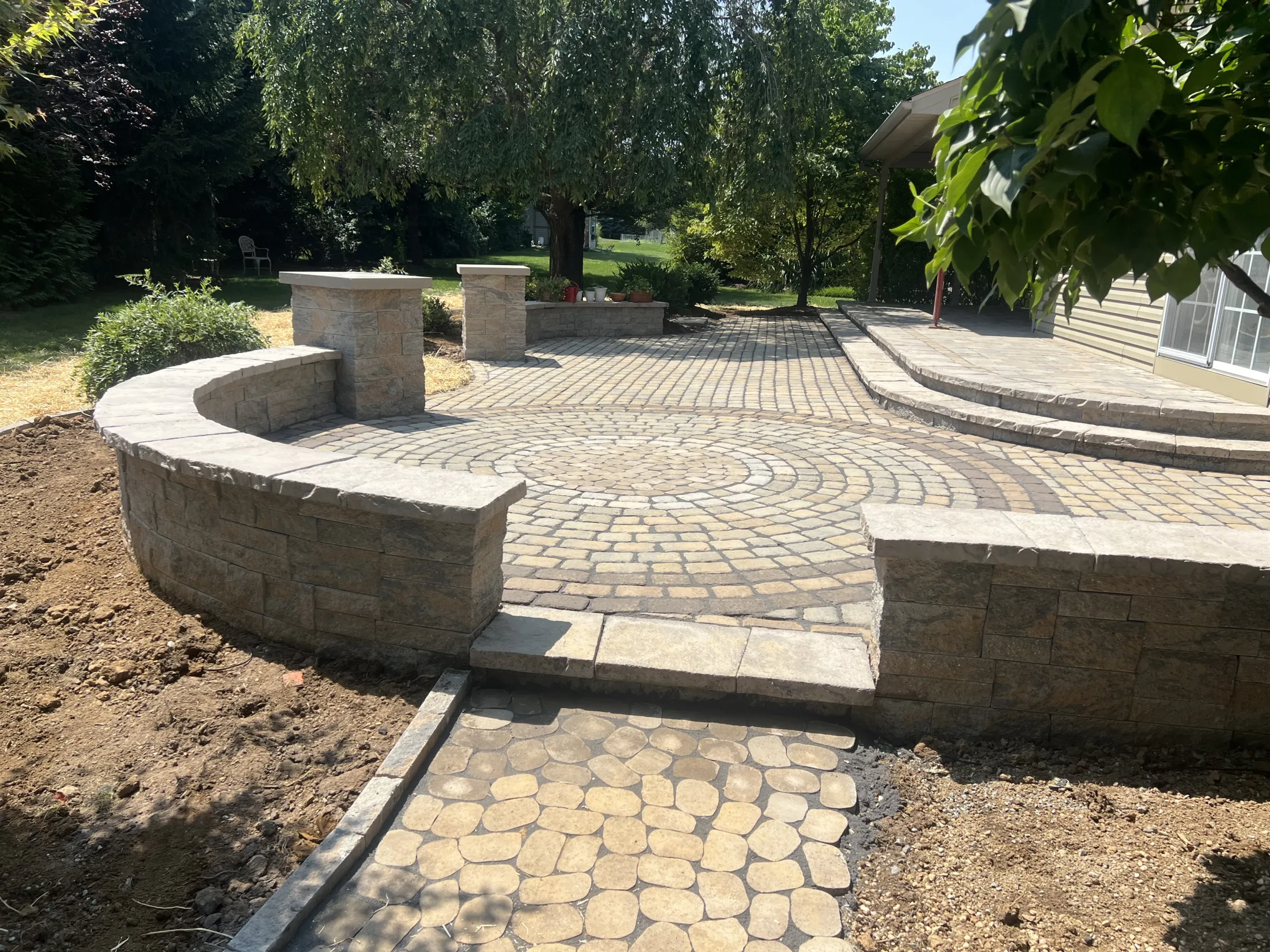 To achieve the desired Old World aesthetic, Techo-Bloc’s Villagio pavers were selected to evoke the timeless character of cobblestone. A blend of Champlain Grey and Chestnut Brown was used to harmonize the patio with the home’s exterior colors. Techo-Bloc’s Architectural Wall system, finished with Portifino caps, was incorporated to create elegant seating walls. Integrated lighting within the walls softly illuminates the pavers at night, enhancing both safety and ambiance while defining the garden spaces. Subtle uplighting on the surrounding trees completes the design, adding warmth and charm to the landscape after dusk.